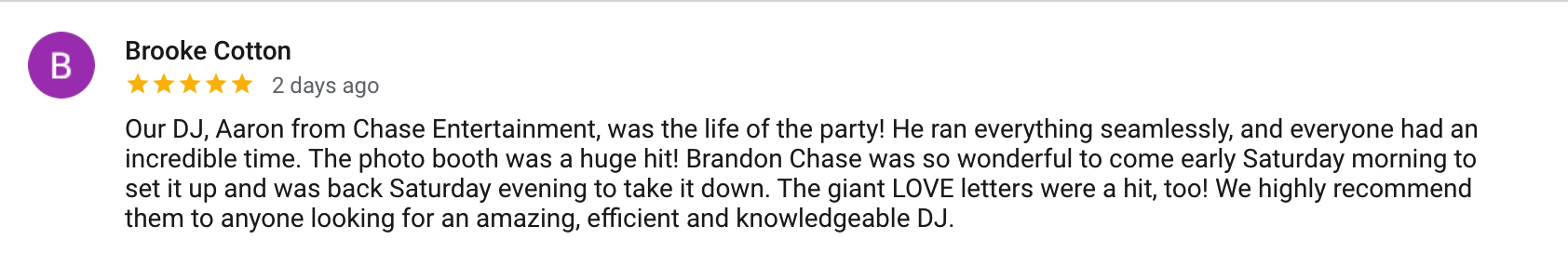 “Brandon is an amazing DJ going above and beyond all expectations to deliver the highest quality experience. I hire him every year for my dance studio showcase, which requires a lot of detail. Brandon has consistently provided my business with outstanding service and presentation. I would strongly recommend chase entertainment for any and all music entertainment..”